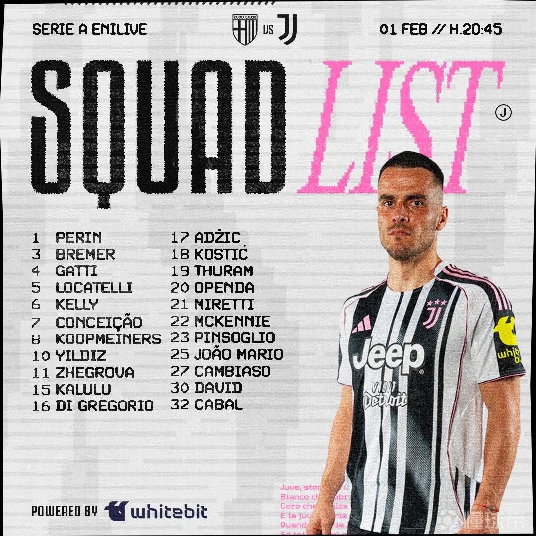 北京时间2月1日,尤文图斯官方公布了意甲第23轮他们做客挑战帕尔马的大名单,布雷默、伊尔迪兹领衔,库普梅纳斯、凯夫伦-图拉姆、乔纳森-戴维在列。尤文客战帕尔马大名单:门将佩林、迪格雷戈里奥、平索利奥后卫布雷默、费代里科-加蒂、劳埃德-凯利、卡卢卢、若昂-马里奥、安德烈亚-坎比亚索、卡瓦尔中场洛卡特利、库普梅纳斯、瓦西里耶-阿季奇、科斯蒂奇、凯夫伦-图拉姆、法比奥-米雷蒂、麦肯尼前锋弗朗西斯科-孔塞桑、凯南-伊尔迪兹、热格罗瓦、奥蓬达、乔纳森-戴维