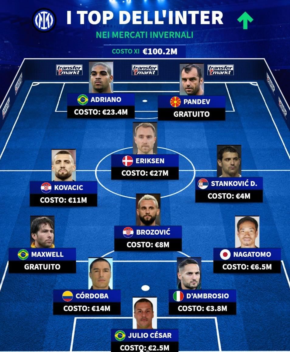 北京时间1月9日,德转列出了国际米兰队史冬窗引援的最成功11人阵容,阿德里亚诺、埃里克森以及长友佑都上榜,同时他们也列出了蓝黑军团冬窗引援的失败11人,巴蒂斯图塔、波多尔斯基以及沙奇里在列。